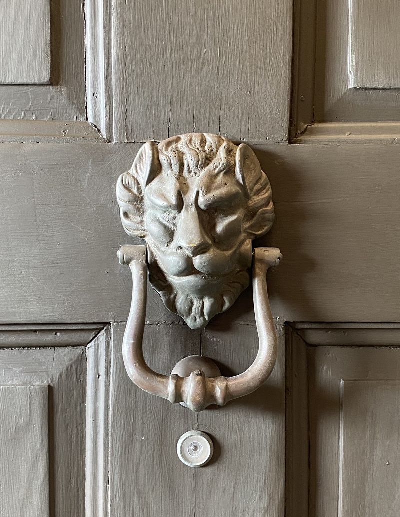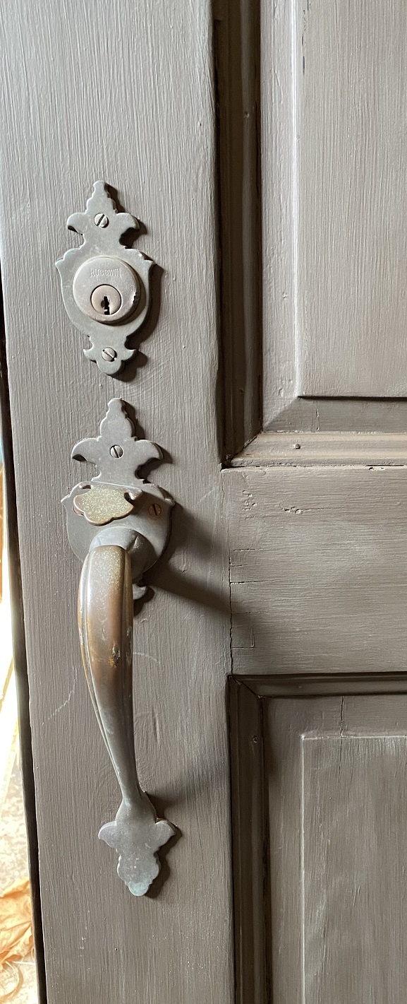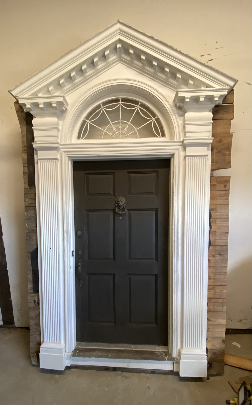 Professionally restored by us, this antique doorway retains its original leaded fanlight window, molding detail, raised paneled door and brass hardware. Frame size 5'8" wide x 10'7" high. Door size - 3'4" x 6'5". This classic doorway will add beauty and character to the front entrance of any home – old or new.