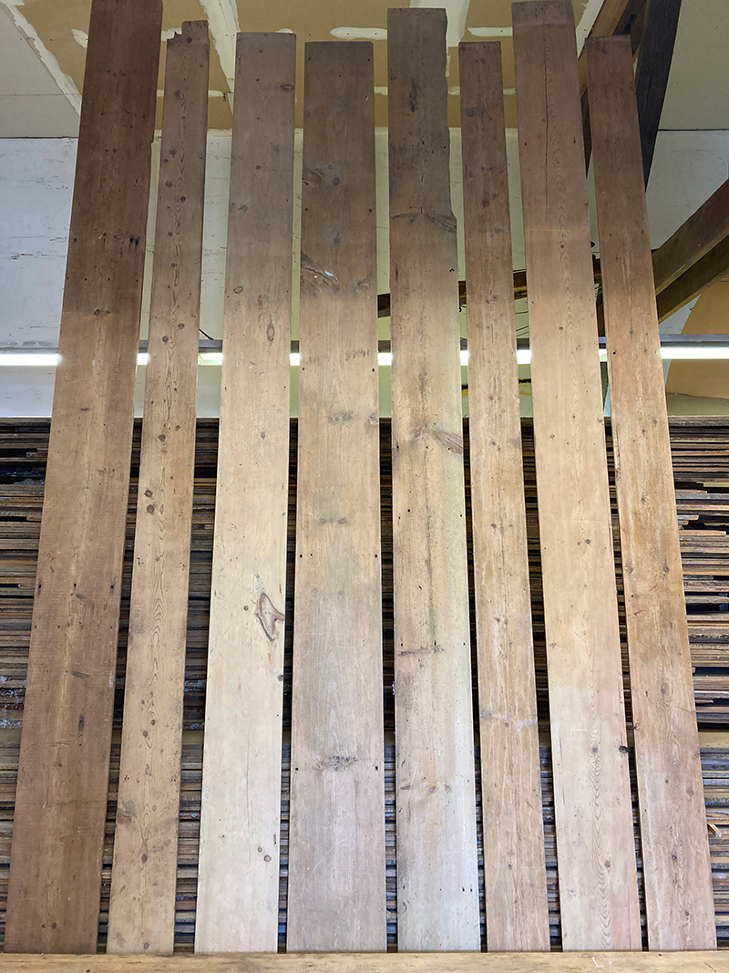 18th and early 19th century flooring. All boards cleaned by hand, no sanding, beautiful natural patina. Eastern white pine, pitch pine (aka hard pine), and white oak. Good widths. Approx. 28000 sq ft. $14/sq ft